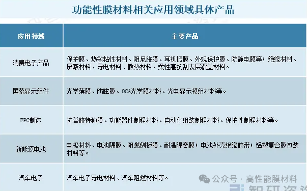功能膜材料行业上游主要包括精细化工、高分子薄膜材料以及生产设备等行业,其中,精细化工行业主要生产粒子、基材、胶水、助剂等多种精细化工材料,高分子材料行业主要生产合成纤维、聚合物薄膜材料等基础原材料;行业下游为应用市场,涵盖消费电子产品、屏幕显示组件、FPC制造、新能源电池、汽车电子等诸多领域。