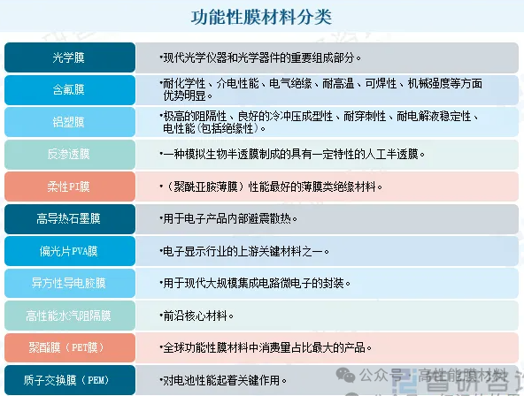 功能性膜材料是指具有光学、电学、分离、阻隔等一种或多种功能的膜材料,是新材料产业的重要分支。功能性膜材料可以分为光学膜、含氟膜、铝塑膜、反渗透膜、柔性PI膜、高导热石墨膜、偏光片PVA膜、异方性导电胶膜、高性能水汽阻隔膜、聚酯膜(PET膜)、质子交换膜(PEM)等类型。