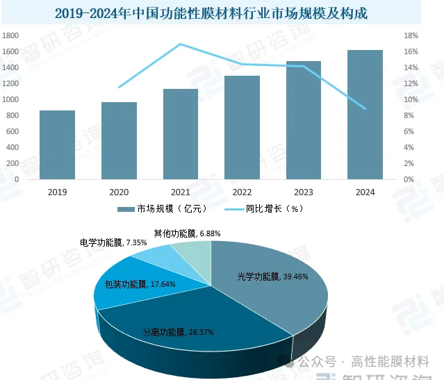 功能性膜材料是我国新材料自主创新发展需攻克的重点材料之一,对我国先进制造业高质量发展具有重要促进作用,近年来,受益于新型显示、新能源、节能环保等下游领域需求扩张影响,我国功能膜材料市场需求与日俱增,市场规模持续扩容,据统计,2024年我国功能膜材料行业市场规模达1623亿元,同比增长8.9%,其中,光学功能膜约占39.46%,分离功能膜约占28.37%,包装功能膜约占17.64%,电学功能膜约占7.35%。